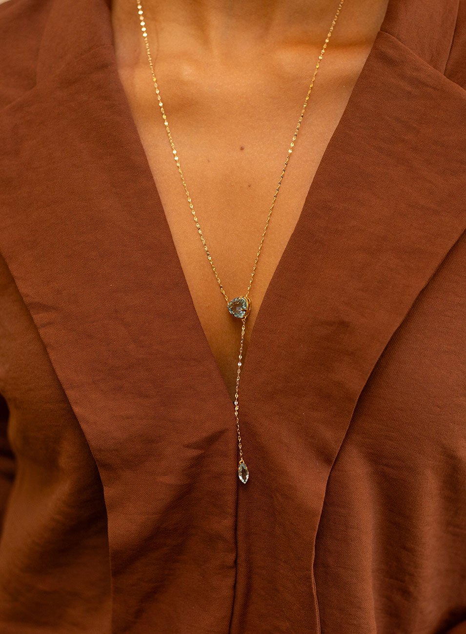 É um colar estilo gravatinha, com corrente extremamente fina e elegante, pensado para acompanhar o movimento do corpo como um traço de luminosidade.