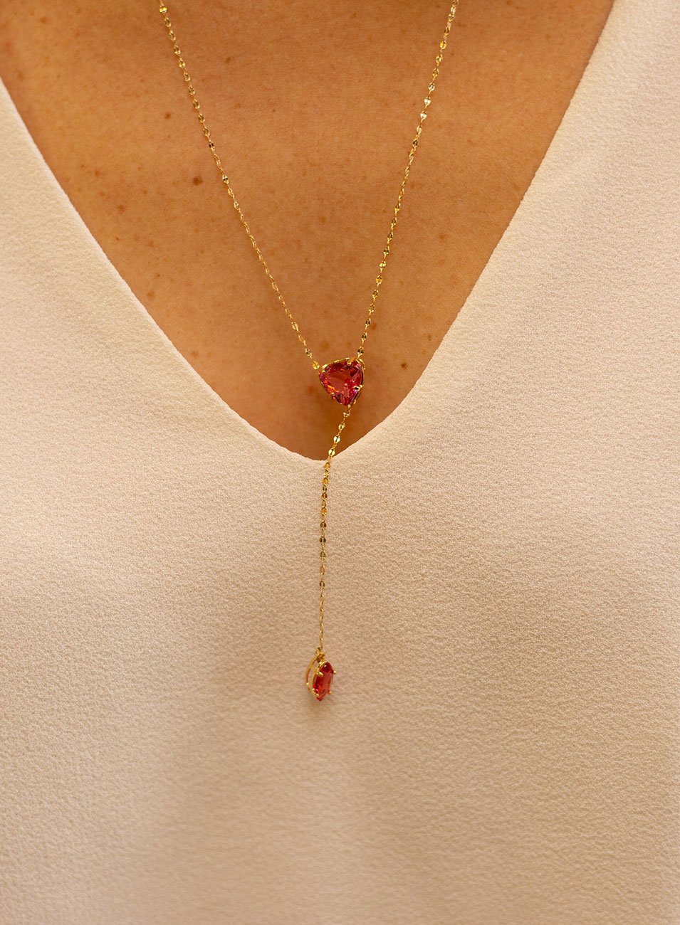 É um colar estilo gravatinha, com corrente extremamente fina e elegante, pensado para acompanhar o movimento do corpo como um traço de luminosidade.