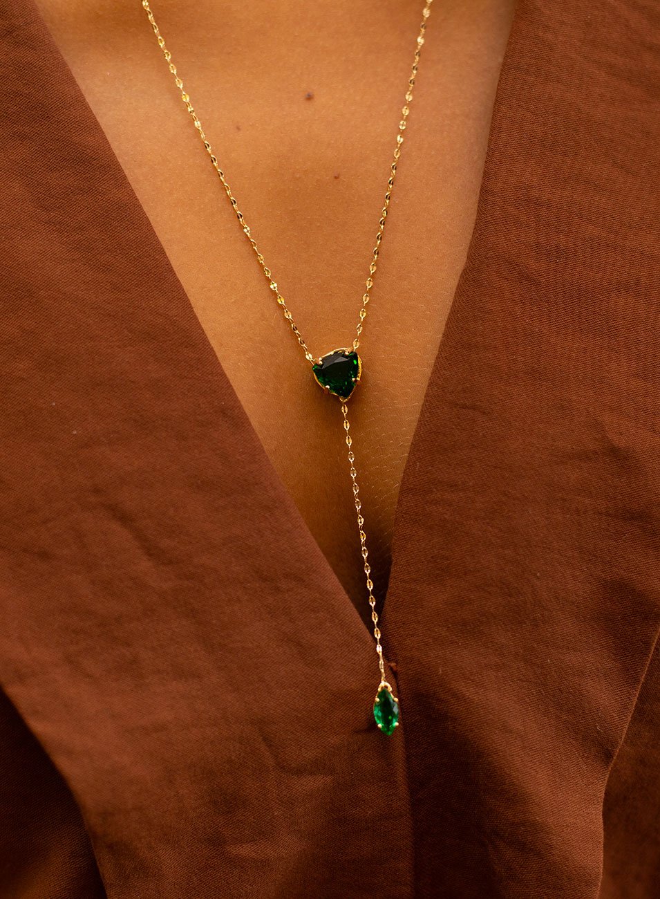 É um colar estilo gravatinha, com corrente extremamente fina e elegante, pensado para acompanhar o movimento do corpo como um traço de luminosidade.