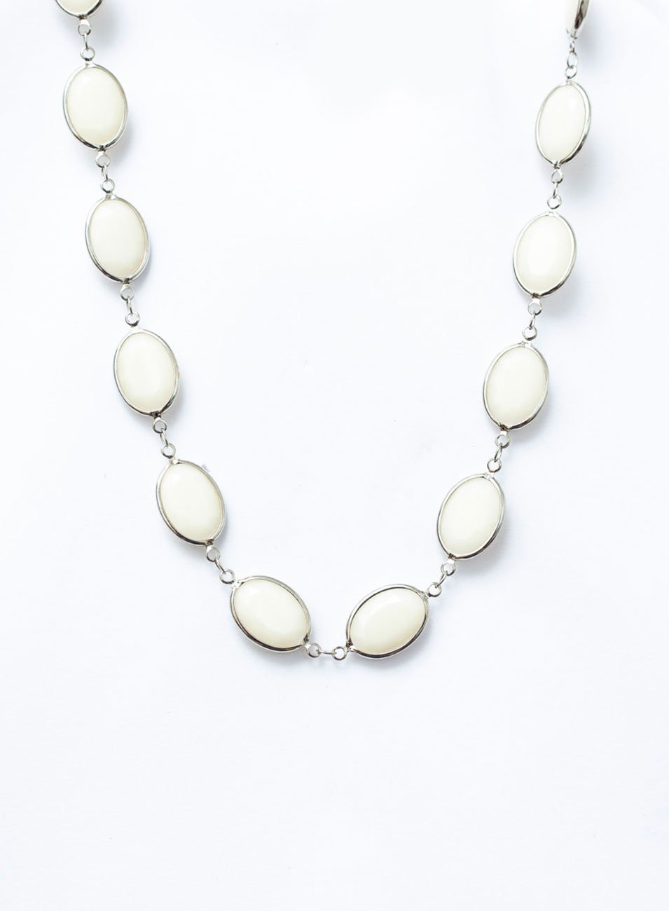O Colar Milka é produzido por corrente de metal, decorada com resinas brancas, aplicadas na estrutura banhada a ródio branco.
