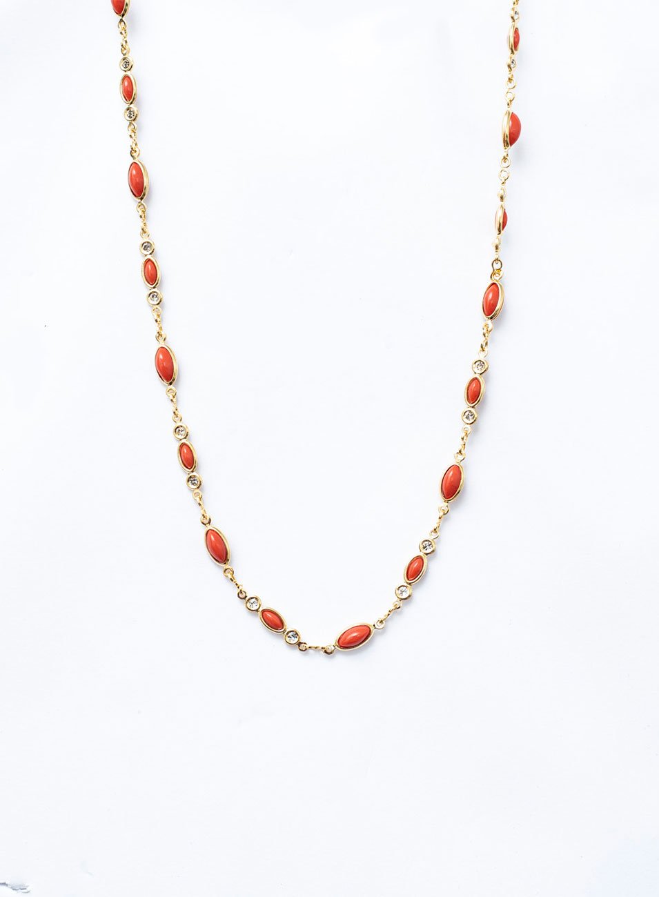 O Colar Ofélia é mais um sofisticado acessório. Feita sob metais nobres banhados a ouro, a joia é produzida com pequenos gomos, estes decorados por resinas corais ao centro. A joia, que possui uma corrente longa bem trabalhada, é ideal para pessoas que amam joias singulares e versáteis.