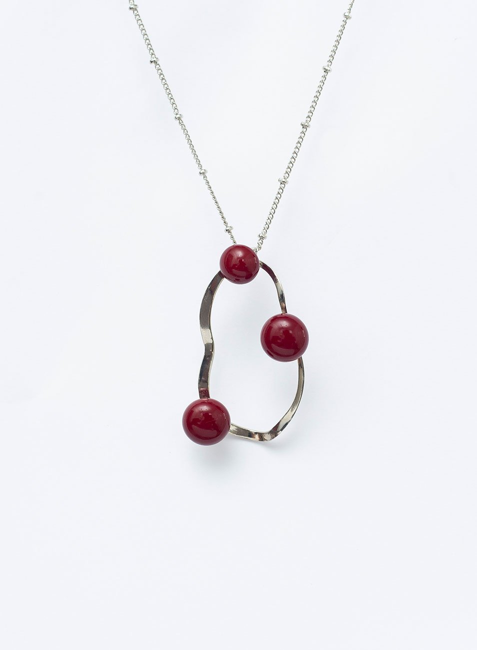 Detalhe: Pingente de metal vazado cravado com pérolas tipo pão na cor cereja