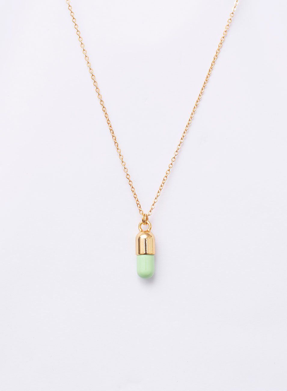 O Colar Pills possui uma corrente fina, banhada a ouro, decorada com um pingente em design de pílula; metade em plaquinha dourada e outra metade em resina verde água.