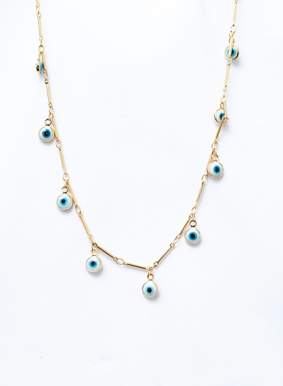 O Colar Protetor é formado por corrente curta, feita em metal nobre e banho ouro. Para dar balanço e charme, a peça conta com aplicação de pingentes resinados, na cor olho grego.