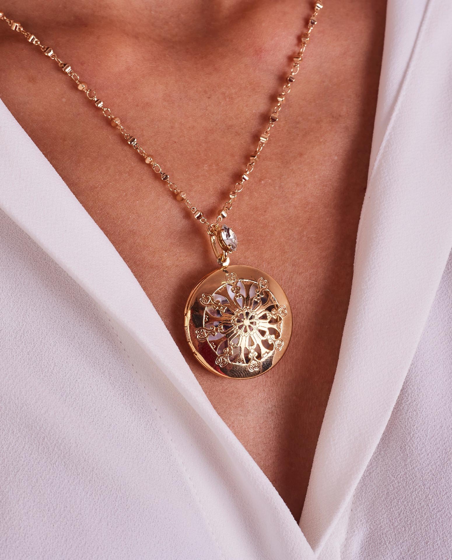 O Colar em evidência é produzido por uma delicada corrente de metal nobre, em banho ouro, que sustenta o pingente, formado por um entremeio de cristal, no formato de navete, seguido do compartimento relicário, com base rebuscada em desenhos de flores.