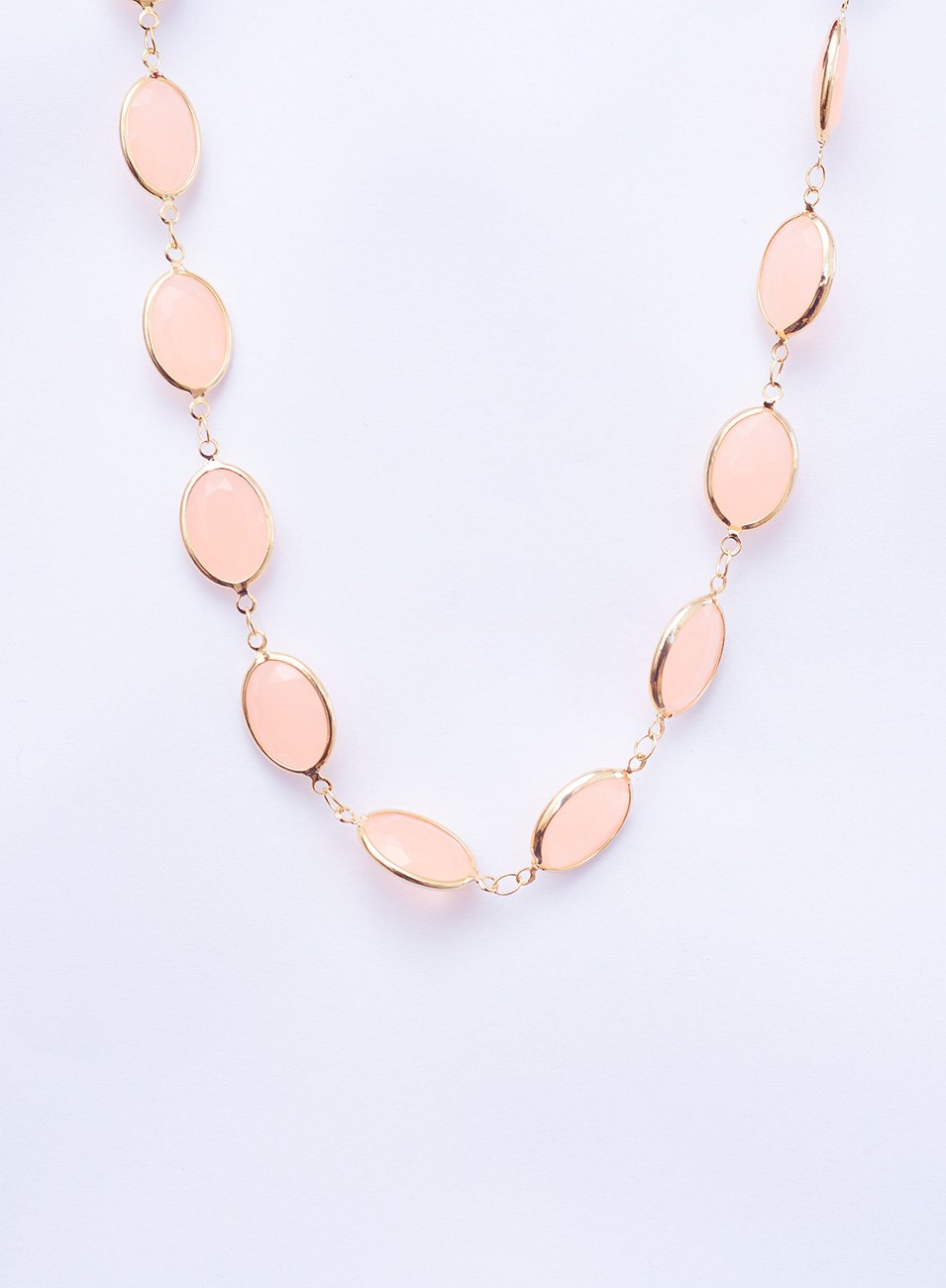 O Colar Silver é formado por estrutura de metal nobre, em banho ouro, decorada por aplicações de resinas ovais, na cor quartzo rosa, por toda a extensão da peça.