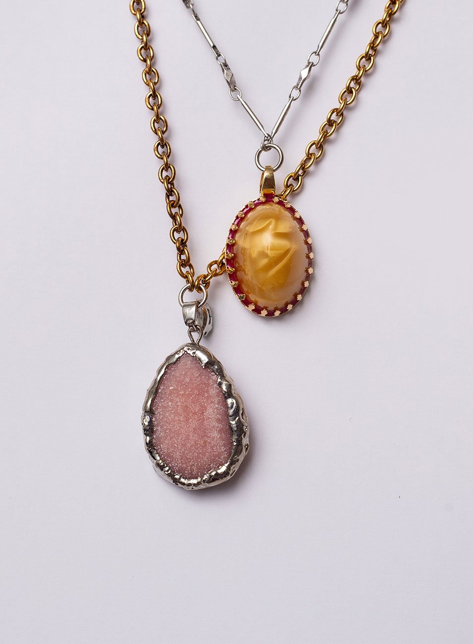 A peça combina diferentes correntes em tons de ouro, ródio branco e chocolate, criando um jogo sofisticado de contrastes metálicos. No centro da composição, dois pingentes revelam a essência da linha Solstício: um cabochão em âmbar reconstituído na cor caramelo, com cravação em formato de coroa e detalhe de esmaltação ao redor da pedra, e uma gota de quartzo rosa envolvida por cravação orgânica em ródio branco.