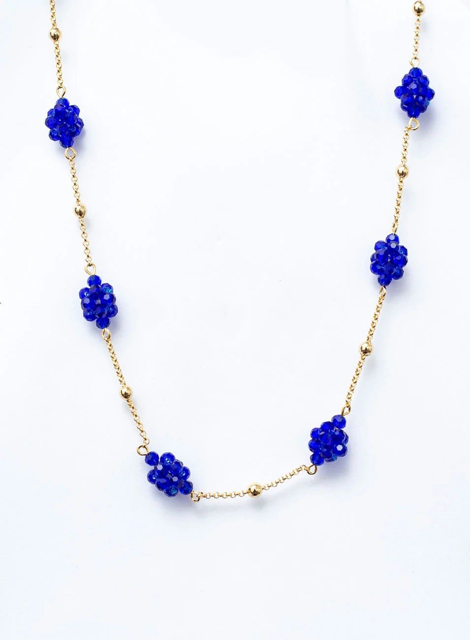O Colar Vine é uma ótima peça para fazer sobreposições, já que é produzida por corrente longa e fina, feita de metal nobre em banho ouro. O acessório ainda conta com aplicações de mini cristais azuis, acoplados juntos, formando espécies de colmeias.