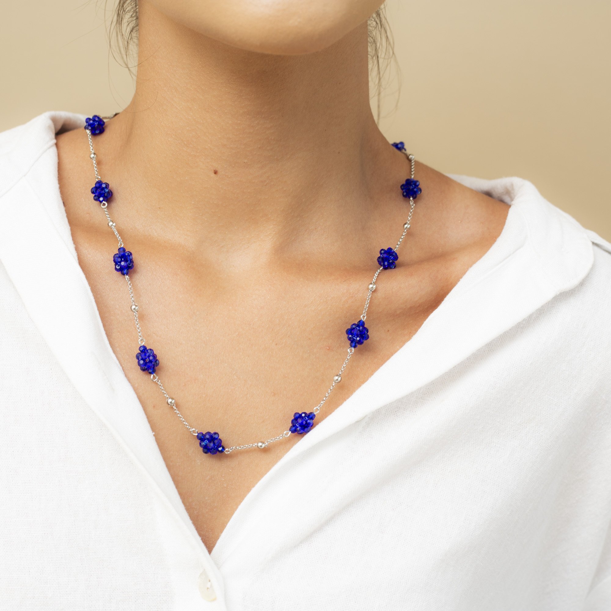 O Colar Vine é uma ótima peça para fazer sobreposições, já que é produzida por corrente longa e fina, feita de metal nobre em banho ródio branco. O acessório ainda conta com aplicações de mini cristais azuis, acoplados juntos, formando espécies de colmeias.