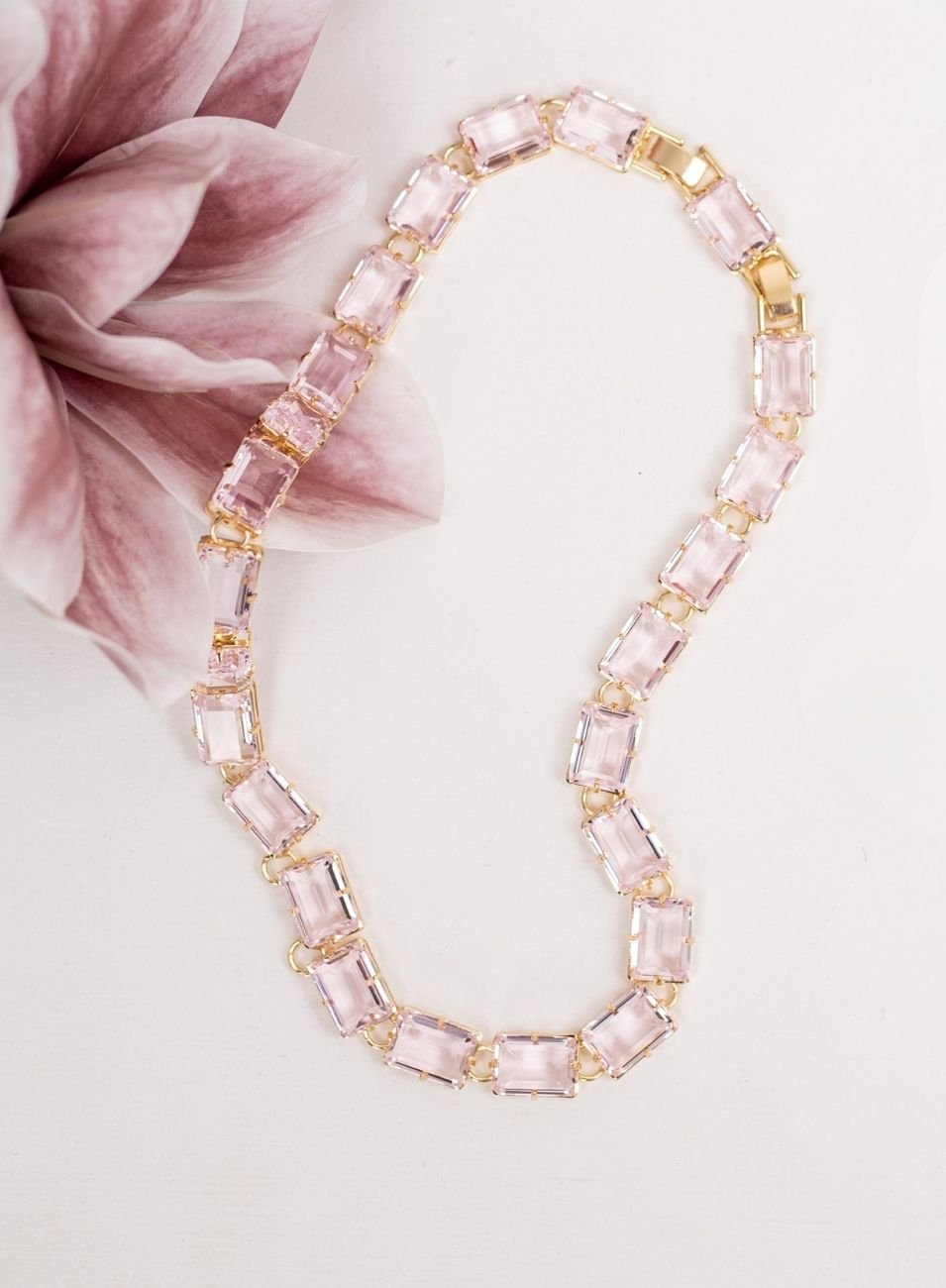 Nesta versão, a peça é composta por cristais retangulares facetados dispostos de forma sequenciada, criando um brilho contínuo e sofisticado que acompanha toda a extensão do colar.
