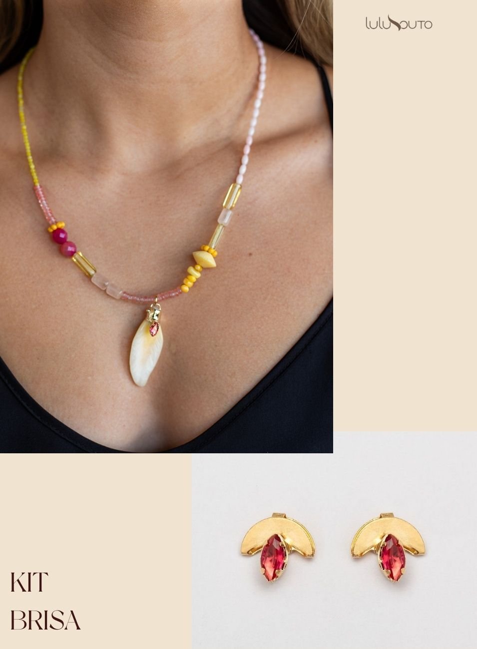 Composto por colar com pedras naturais em tons suaves de rosa e amarelo — como quartzo, jade e coral — e brincos banho de ouro com cristal na cor rubelita, o conjunto transmite frescor, delicadeza e feminilidade vibrante.