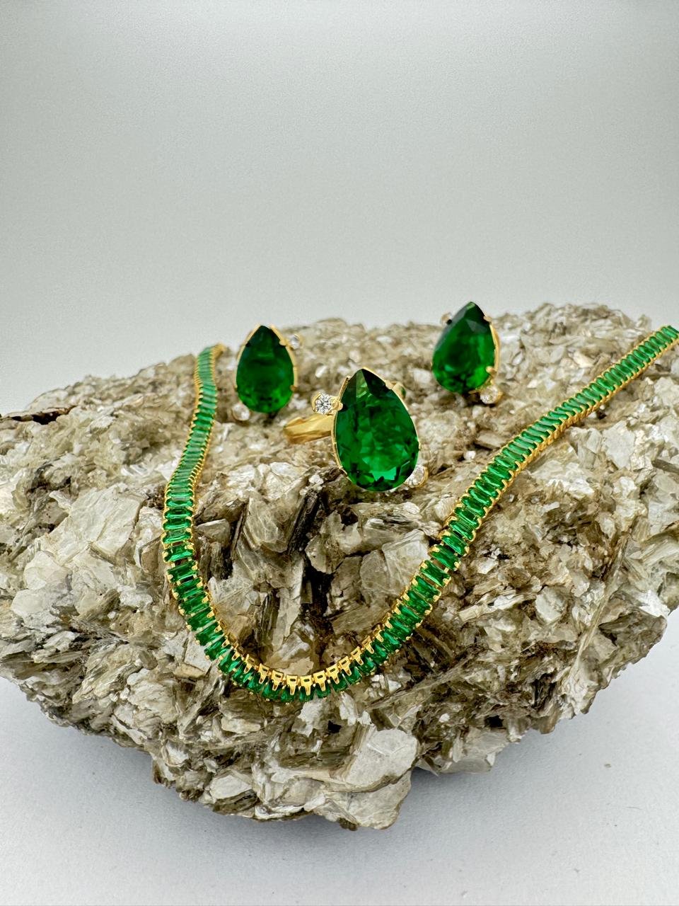 Composto por colar riviera de cristais verdes, brincos e anel com pedra em formato de gota na cor verde esmeralda, o kit transmite presença e personalidade em cada detalhe.