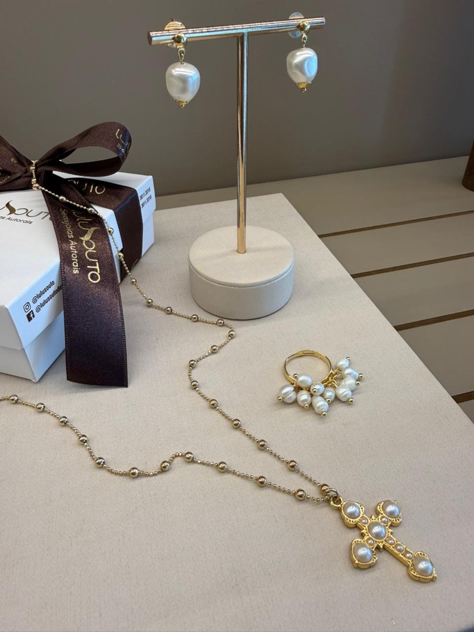 Composto por colar com pingente de cruz adornado por pérolas e brincos com pérola orgânica, o conjunto traz sofisticação atemporal em uma leitura contemporânea.