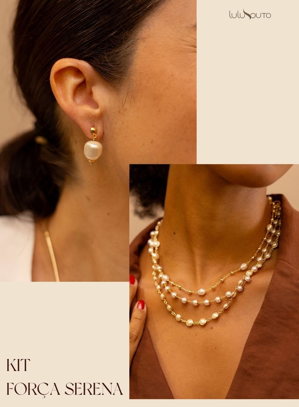 Composto por colar de múltiplas voltas com pérolas intercaladas por detalhes dourados e brincos clássicos de pérola, o conjunto une sofisticação e presença em uma composição atemporal.