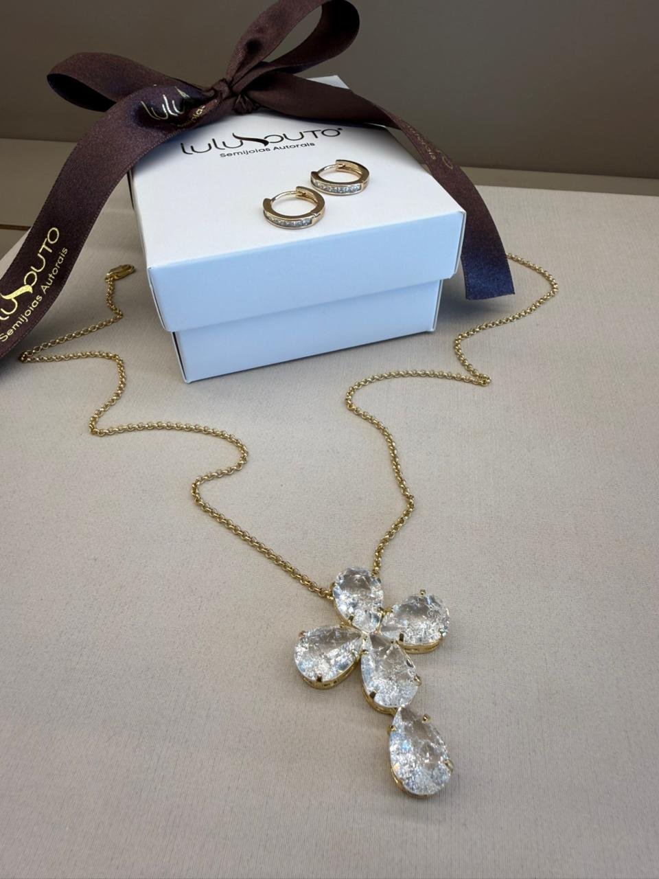 Composto por colar com pingente de cruz cravejado em cristais e argolas delicadas com zircônias, o conjunto traduz leveza, espiritualidade e elegância atemporal.