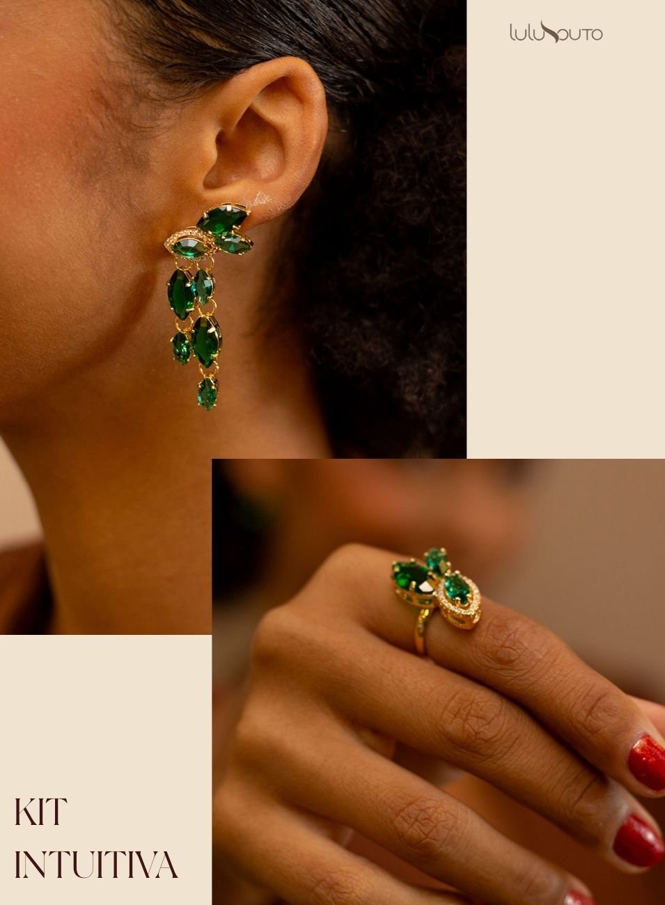 Composto por brincos longos com cristais em tom verde intenso e anel marcante com pedras verdes cravejadas, o conjunto traduz elegância, profundidade e presença magnética.