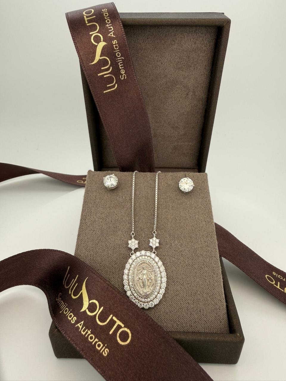 O colar apresenta medalha religiosa ricamente detalhada, envolvida por um halo de moissanites que potencializam o brilho e criam um efeito luminoso intenso e refinado. As estrelas na corrente adicionam delicadeza e simbolismo à composição.