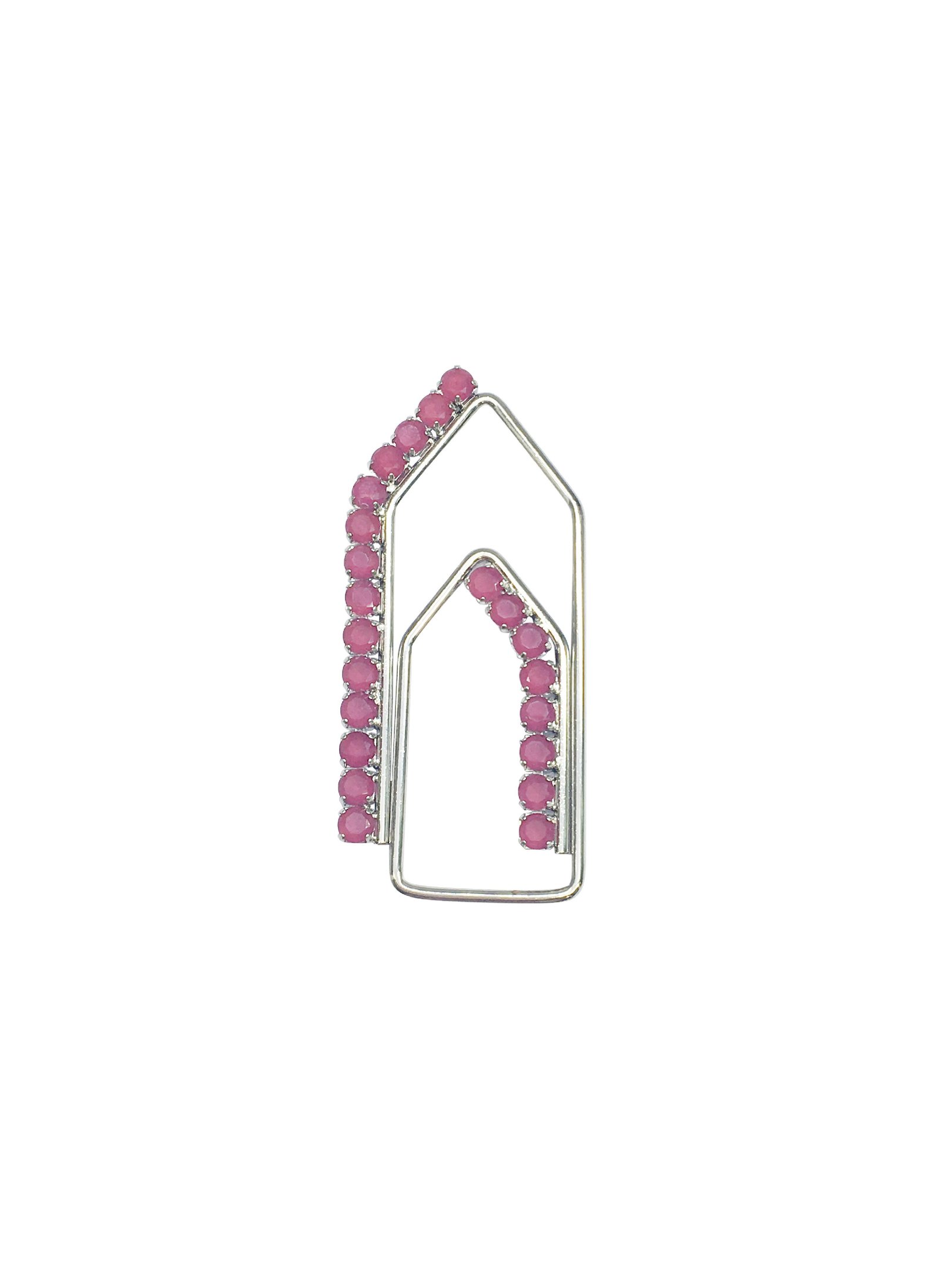 Pingente em formato de clips com detalhes em zircônias rosa e banho de ródio branco.