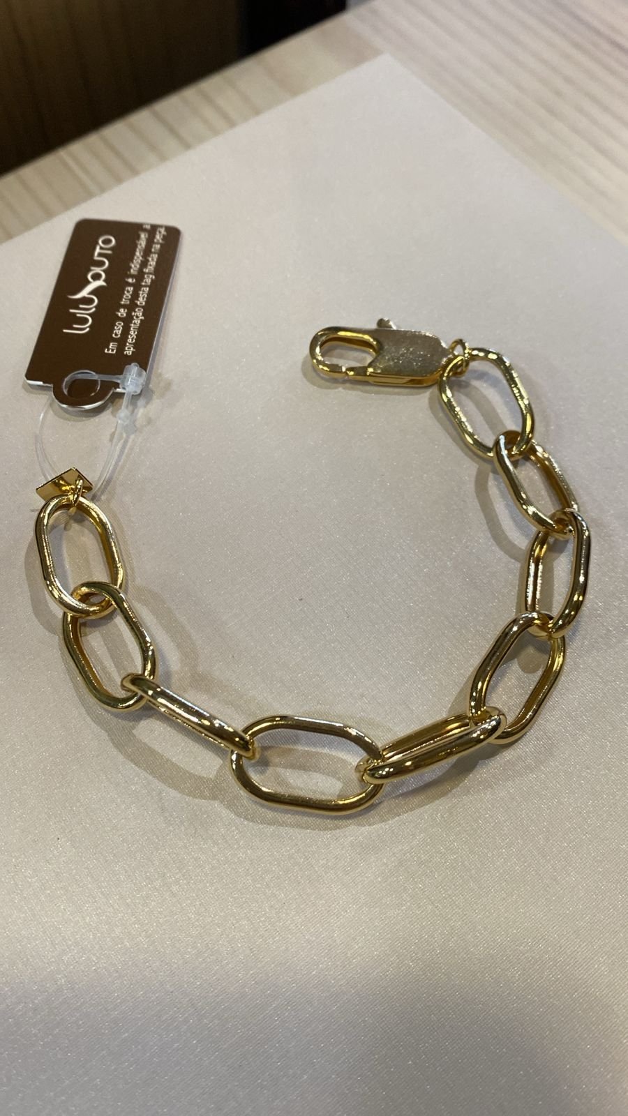 A Pulseira Clip é formada por corrente cadeado, de elos ovais, feita por metal nobre, em banho ouro.