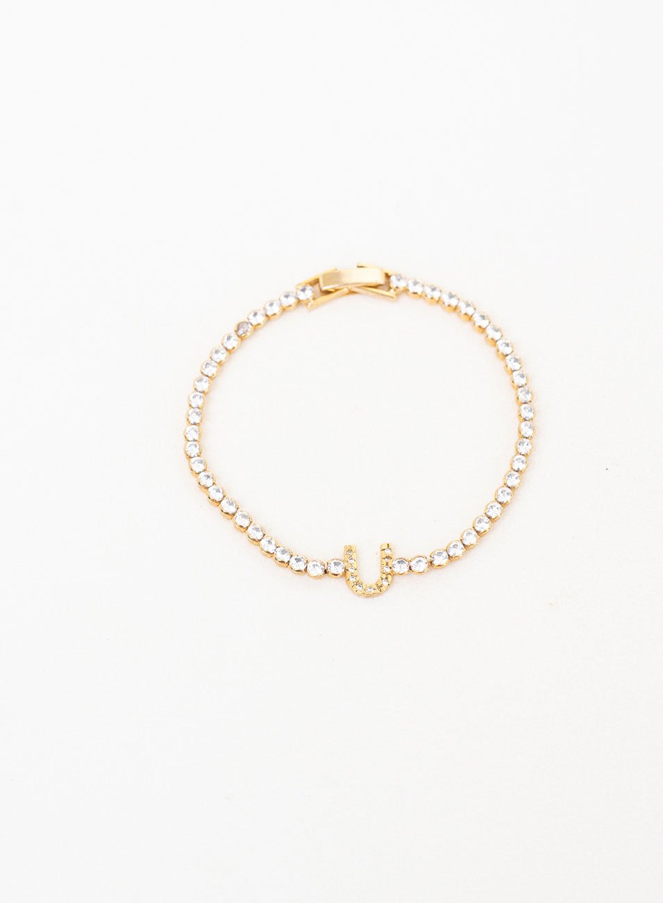 A Pulseira Dennya contempla uma estrutura de metal nobre, em banho ouro, com corrente riviera decorada por cristais em cravação portuguesa. O acessório se faz único devido ao lindo pingente de mini zircônias, com design de letra, aplicado ao centro da peça.