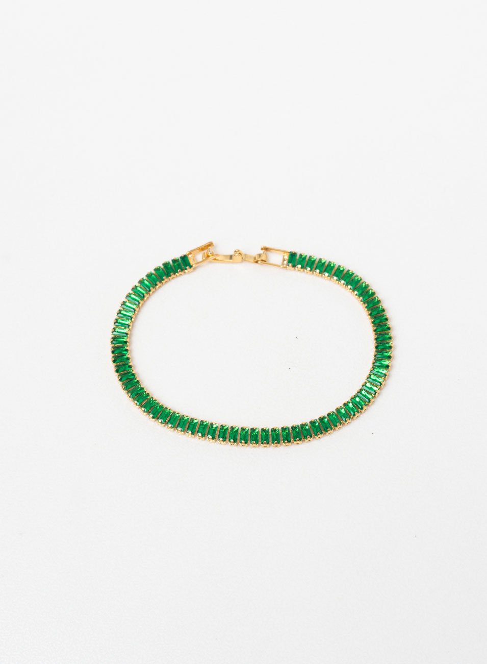 A Pulseira Exxu é uma peça deslumbrante que acrescenta elegância e charme ao seu pulso. Sua corrente estilo riviera é adornada com cristais baguete verde escuro, proporcionando um brilho sutil e sofisticado. Com um banho em ouro, esta pulseira possui um acabamento luxuoso e refinado.