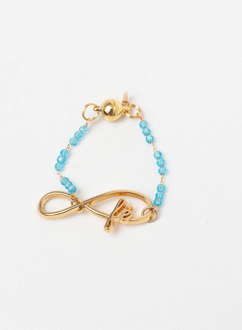 A Pulseira em destaque conta com corrente de metal nobre, banhada a ouro, decorada por cristais de vidro azuis. A joia ainda conta com pingente de placa de metal, em design infinito.