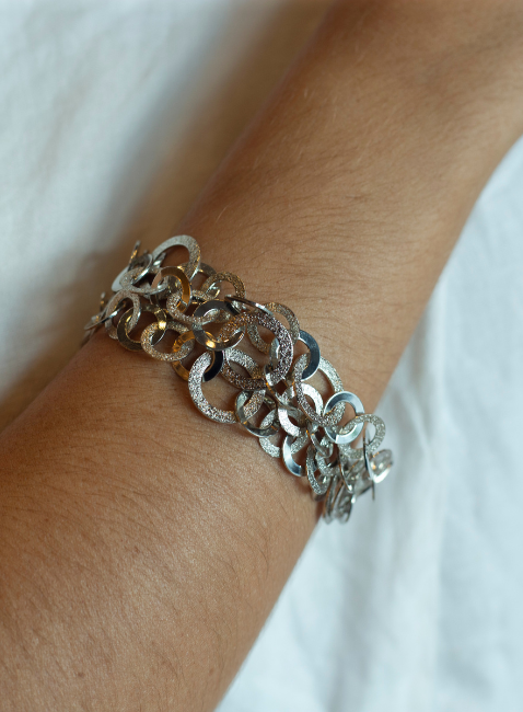 Deslize esta pulseira elegante e sofisticada em seu pulso para um toque instantâneo de estilo. Apresentando um encantador mix de correntes em argolas foscas e lisas, esta peça é uma expressão de elegância moderna.
