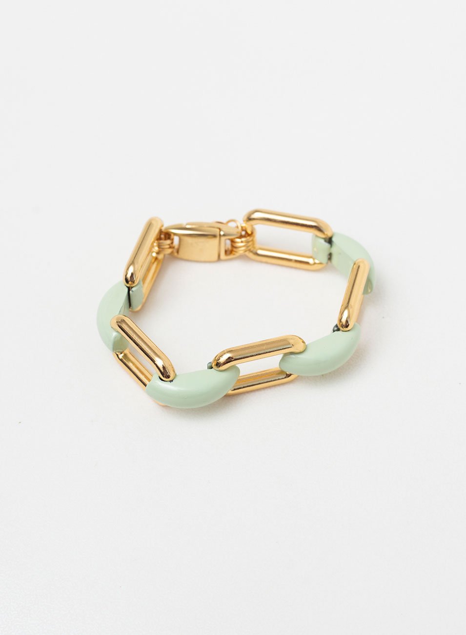 A Pulseira Mazzi recebe uma corrente de elos quadrados, feitos de metal nobre em banho ouro. A joia ainda conta com plaquinhas em esmaltação na cor verde.