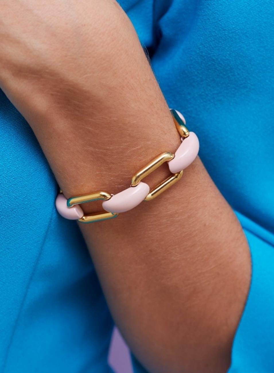 A Pulseira Mazzi recebe uma corrente de elos quadrados, feitos de metal nobre em banho ouro. A joia ainda conta com plaquinhas em esmaltação na cor rosa quartzo.