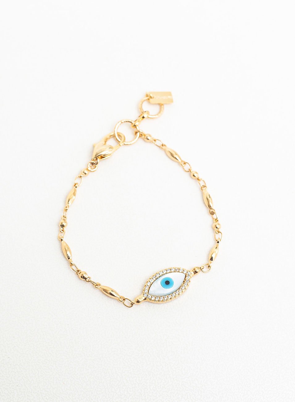 Ao centro da pulseira, há um pingente de olho grego esmaltado, que traz um toque de cor e proteção à joia, além de micro zircônias ao redor. O olho grego é um talismã conhecido por sua capacidade de afastar o mau-olhado e trazer boa sorte. O pingente é feito em metal nobre banhado a ouro, com acabamento em esmalte azul e branco, e é fixado na corrente por um delicado elo.