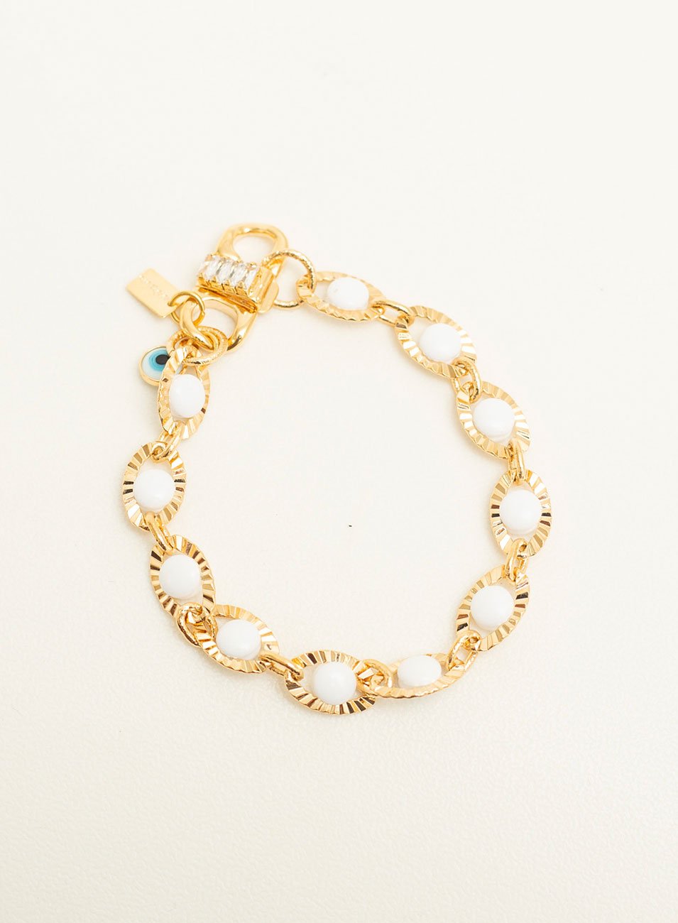 Aprimore seu estilo com a Corrente de Resina Branca da Lulu Souto. Este elegante colar apresenta uma corrente com resina branca, complementada por um deslumbrante pingente de olho grego de murano e detalhes encantadores em zircônia baguete, tudo em um belo banho de ouro.