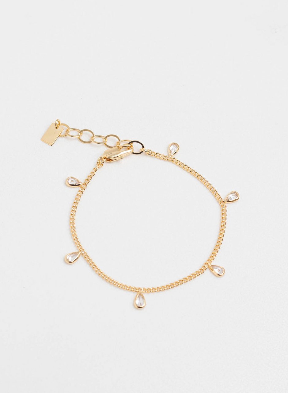 O destaque principal da pulseira são as zircônias em formato de gota, incolores, que são aplicadas de forma meticulosa e elegante por toda a sua estrutura. Essas zircônias possuem um brilho deslumbrante, refletindo a luz de maneira espetacular e irradiando uma aura de elegância e beleza.