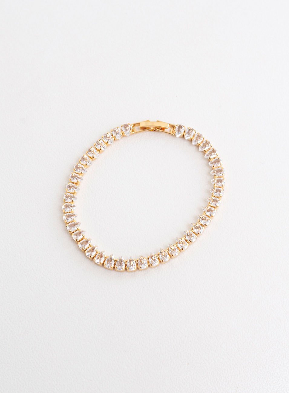 Com um banho em ouro, a pulseira adquire um brilho dourado que acentua a beleza das zircônias. Cada zircônia gota incolor é cuidadosamente cravada na peça, proporcionando um brilho intenso e cativante.