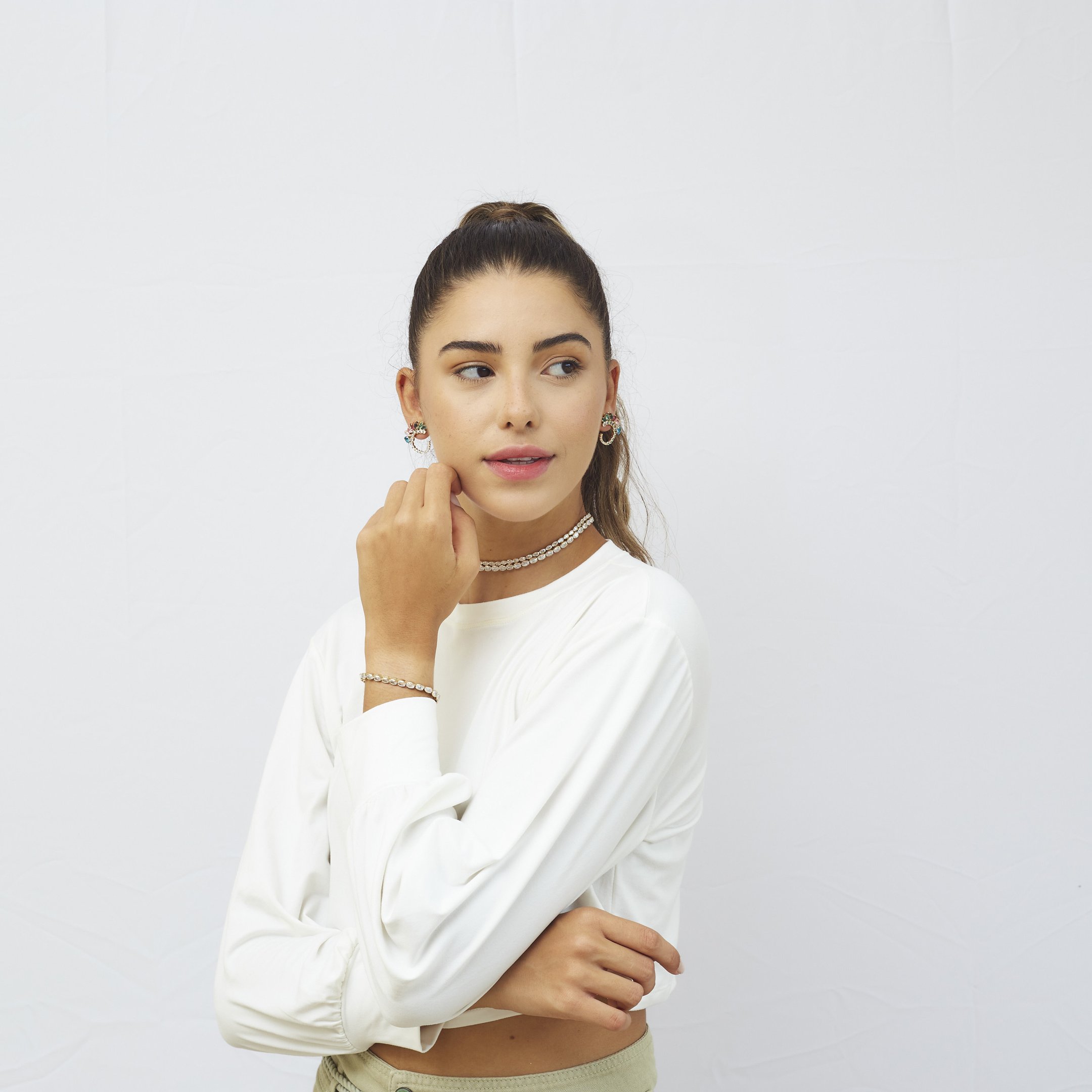 A Pulseira destacada é produzida por uma corrente riviera de metal nobre, em banho ouro, decorada com zircônias ovais incolores.